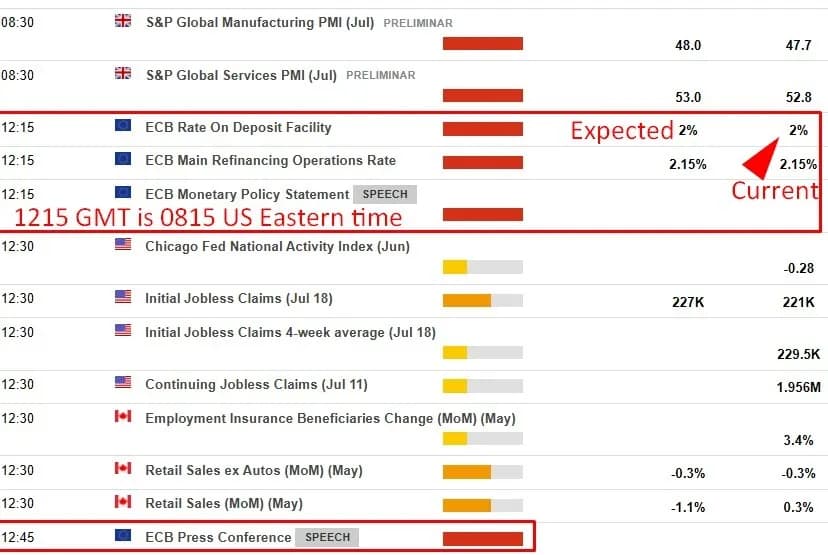 بانک مرکزی اروپا قرار است در نشست امروز، پنجشنبه ۲۴ ژوئیه ۲۰۲۵، نرخ بهره را بدون تغییر حفظ کند. بیانیه مطبوعاتی این بانک ساعت ۱۲:۱۵ به وقت گرینویچ (۱۸:۱۵ به وقت شرق آمریکا) منتشر خواهد شد و کریستین لاگارد، رئیس بانک مرکزی اروپا، نیم ساعت بعد سخنرانی خواهد کرد.