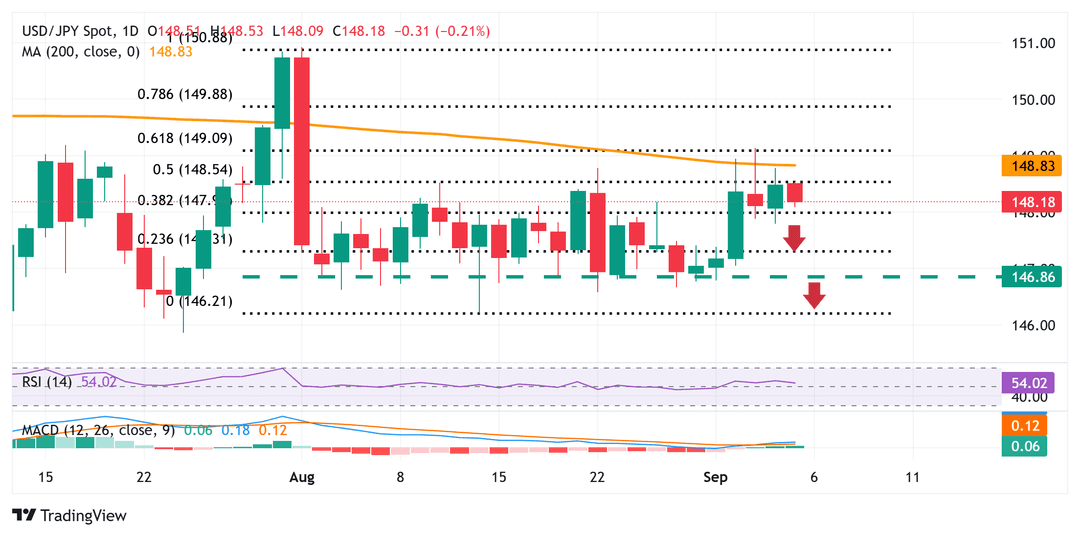 از منظر تکنیکی، شکست های پشت سر هم نزدیک به میانگین متحرک 200 روزه طی دو روز گذشته و سقوط بعدی، به نفع فروشندگان USD/JPY عمل کرده است. با این حال، نوسانگرهای اندکی مثبت در نمودار روزانه ایجاب می کند قبل از موقعیت گیری برای افت های بیشتر، منتظر ادامه فشار فروش و تثبیت زیر سطح 148.00 باشیم.