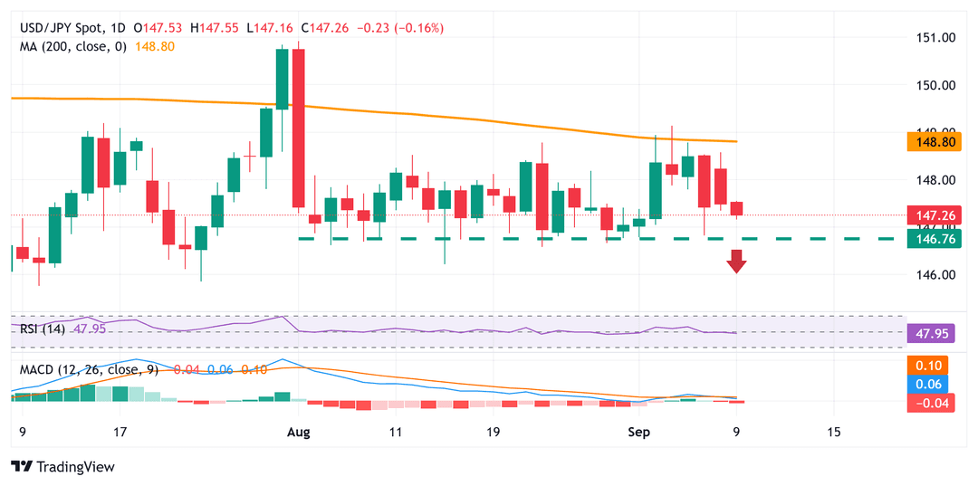 در سوی مقابل، اوج جلسه آسیایی در حوالی 147.50-147.55 اکنون بهعنوان یک مقاومت قیمتی فوری عمل میکند. تثبیت قدرت فراتر از این محدوده ممکن است موجب بسته شدن موقعیتهای فروش و بازپسگیری سطح 148.00 شود. حرکت صعودی میتواند بیشتر ادامه یابد اما احتمال دارد بهسرعت نزدیک میانگین متحرک 200 روزه در حوالی 148.75 متوقف شود. سطوح بالاتر شامل رقم گرد 149.00 و ناحیه 149.20 است که اگر شکسته شوند، مومنتوم کوتاهمدت را به نفع خریداران تغییر خواهد داد. در این صورت قیمت ممکن است تا 150.00 روانی و سپس به چالش کشیدن اوج نوسان ماه اوت در حوالی 151.00 پیش برود.