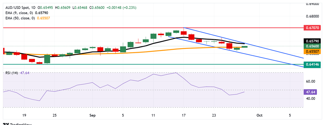جفت AUD/USD در محدوده 0.6560 در روز دوشنبه معامله میشود. تحلیل تکنیکی روی نمودار روزانه نشان میدهد که جفت هنوز در داخل یک الگوی کانال نزولی قرار دارد که نشاندهنده این است که احساسات بازار سوگیری نزولی دارد. همچنین شاخص قدرت نسبی (RSI) 14 روزه کمی زیر سطح 50 قرار گرفته که سوگیری نزولی را تقویت میکند.