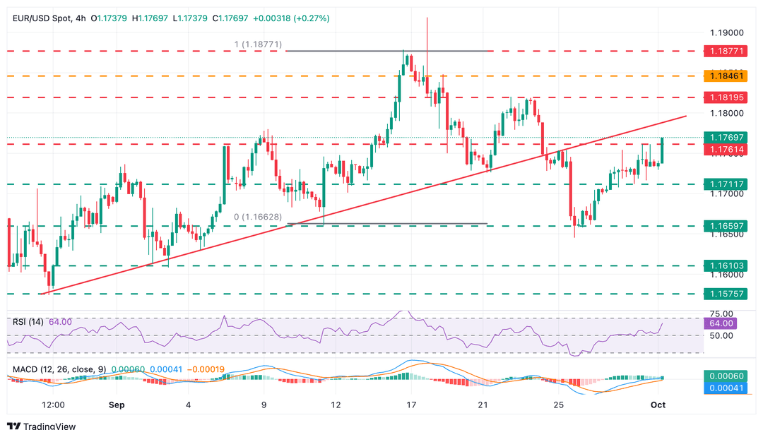 یورو روز چهارشنبه برای چهارمین روز متوالی رشد کرد و بالای 1.1770 تثبیت شد، همزمان که ضعف گسترده دلار آمریکا جفت ارز EUR/USD را تقویت کرد. تعطیلی دولت فدرال ایالات متحده دلار آمریکا را در وضعیت تدافعی قرار داده است و در اروپا چشم ها معطوف به انتشار اولیه آمار تورم سپتامبر است.